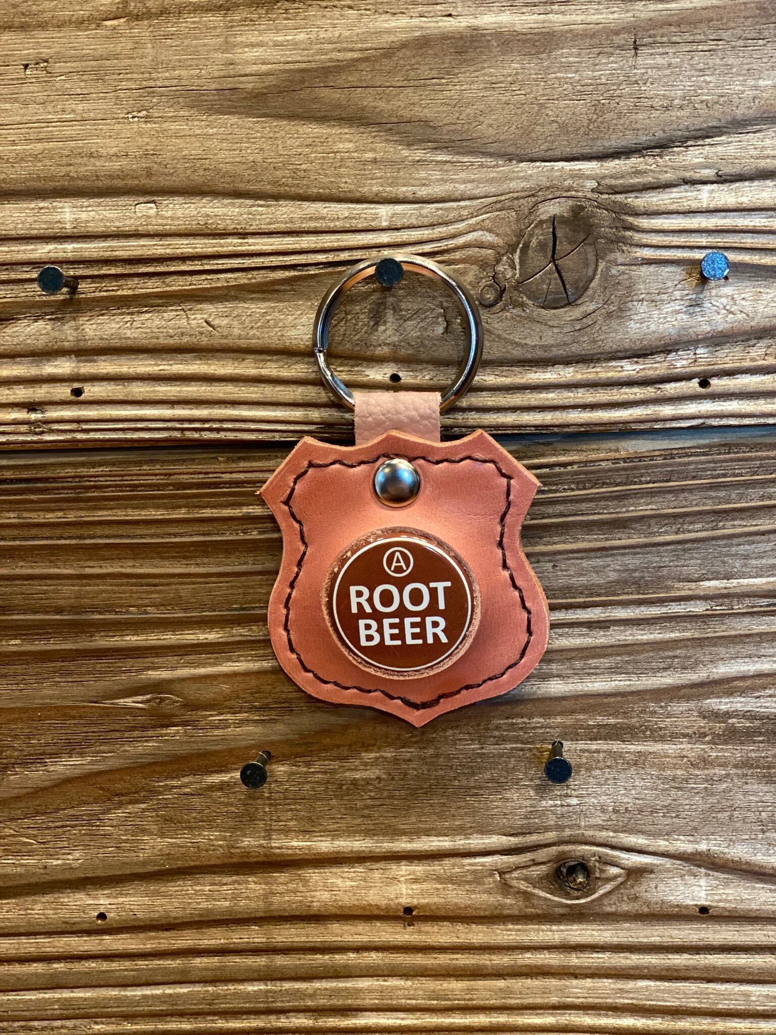 1900年代初頭に使用されていたデザインのビールやソーダの王冠キャップと、端材のヌメ革を使用したキーリングです。