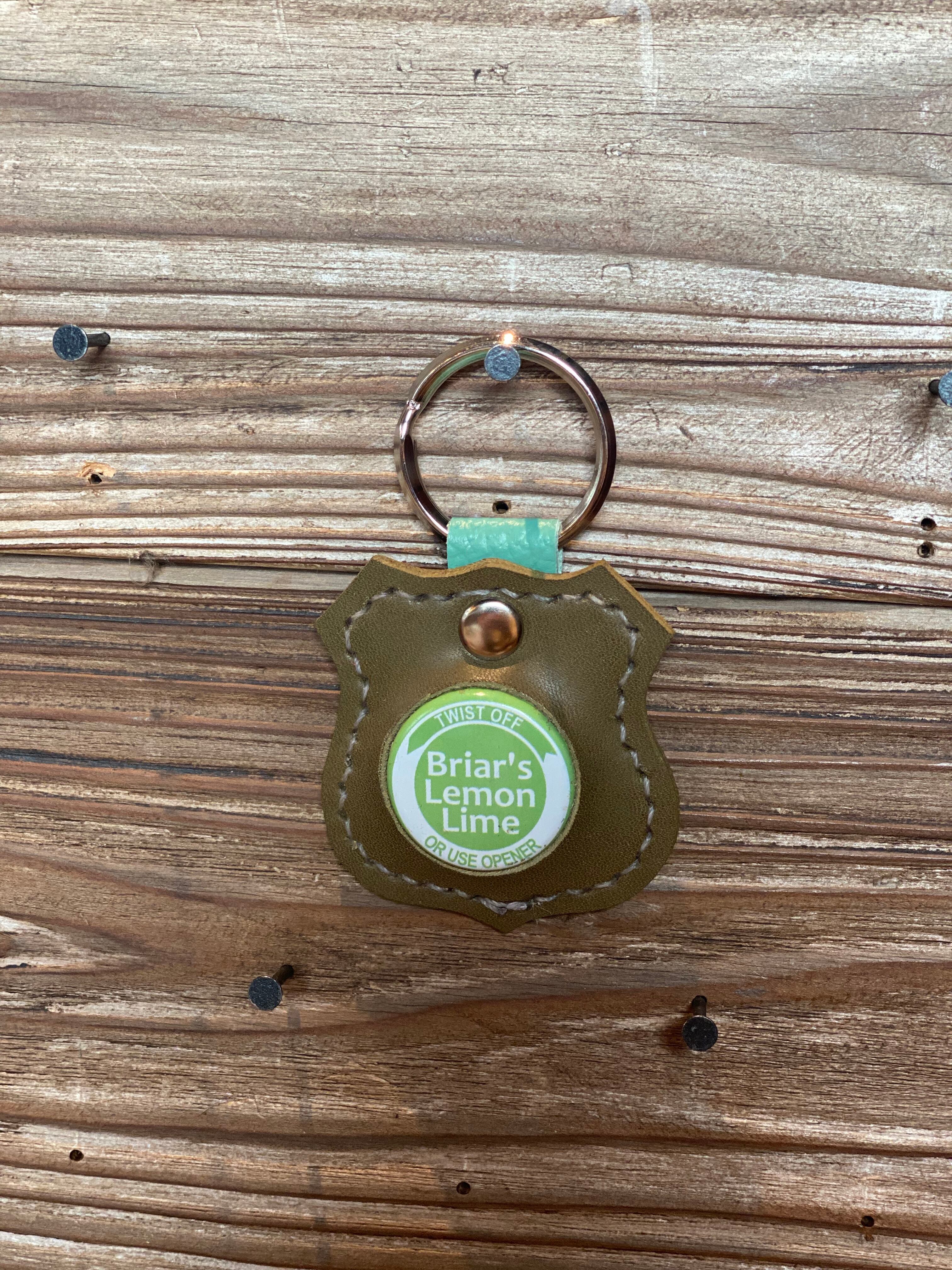 1900年代初頭に使用されていたデザインのビールやソーダの王冠キャップと、端材のヌメ革を使用したキーリングです。