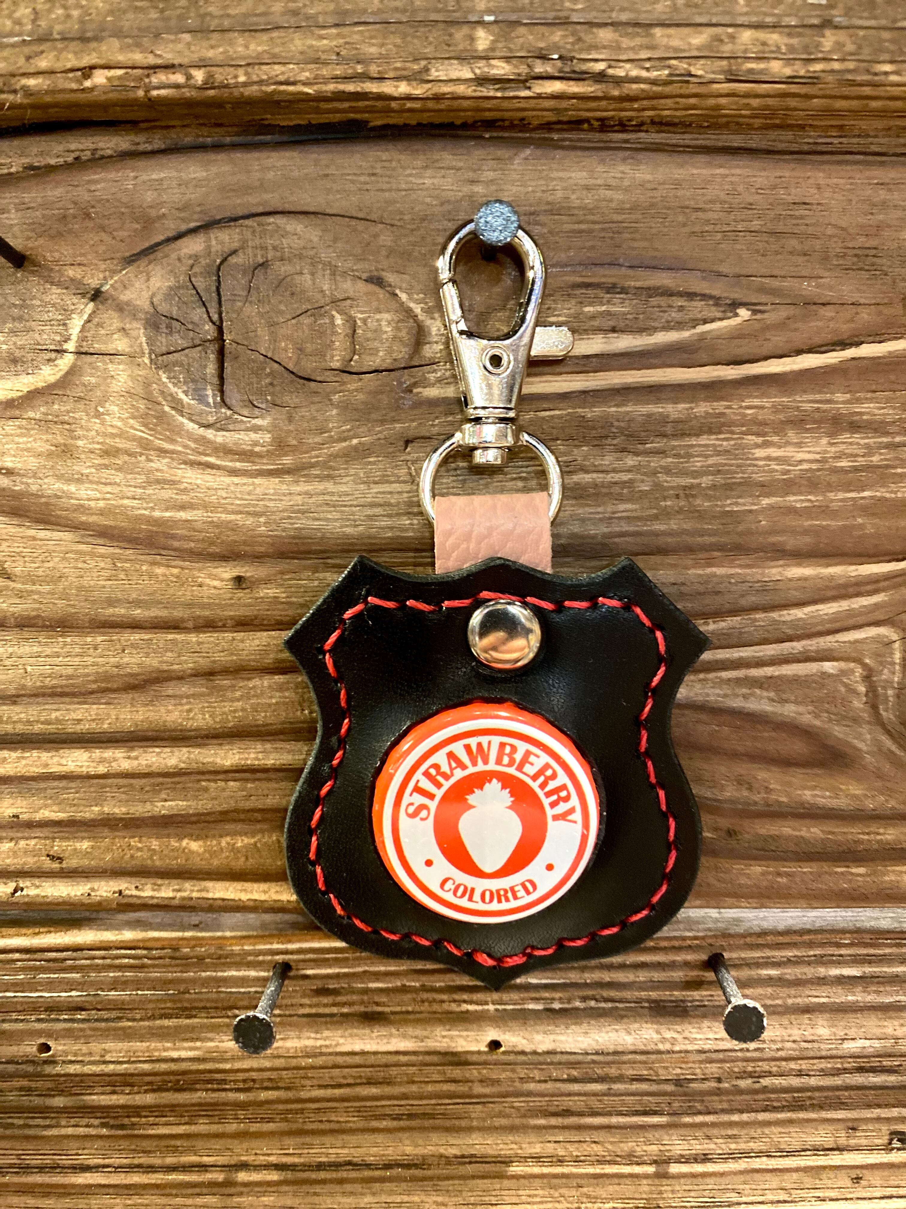 1900年代初頭に使用されていたデザインのビールやソーダの王冠キャップと、端材のヌメ革を使用したキーリングです。